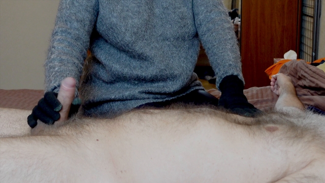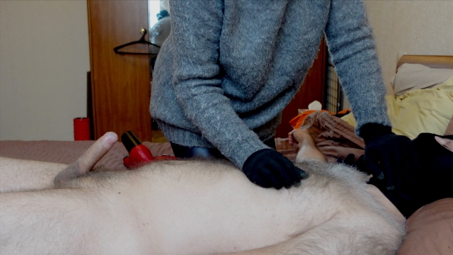Milf teases naked guy with wool gloves. He came without a single touch of his cock.
