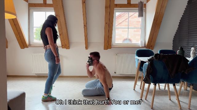 STEP-DADDY’S BACK! I invited Melanie to kick balls for the first time. Surprisingly enough she didn’t seem as a beginner but a woman who has cracked some nuts in her life. Maybe when she was a girl? She wears skinny jeans and sneakers which makes the video extra hot. I am putting off my shirt during the video but she is not intimidated by my muscles at all! She rather enjoys the fact she can even bring a muscular guy to the ground by only a swift kick to his nutsack. Enjoy!
