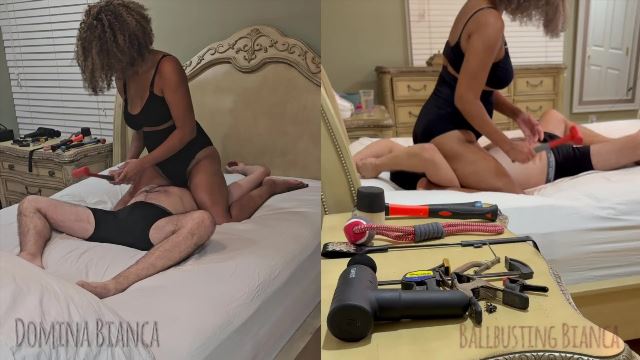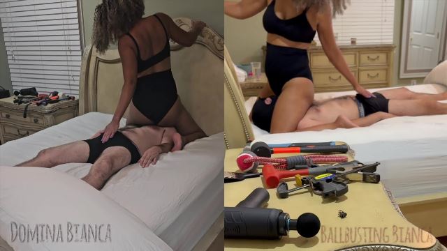 I use a plethora of object to batter his useless balls. When he tries to get a nut I relentlessly punched his balls while I sat on his loser face until he ran out of steam.