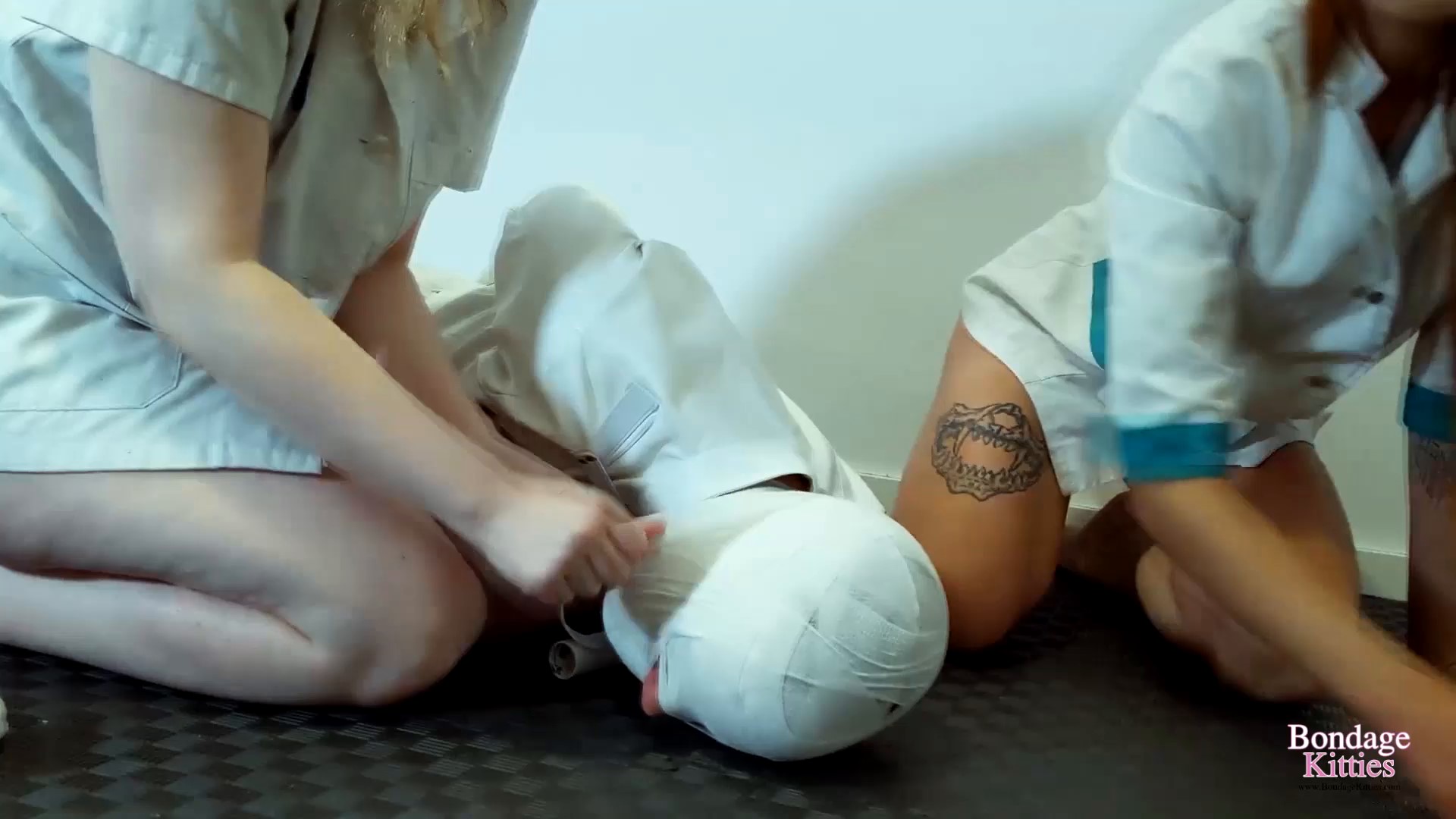 Jack is a patient at the asylum, the two sexy nurses Nereida and Lex from the night shift take Jack the vitamins that he must take every night, he does not have an attitude to collaborate, he starts to insult the young nurses. They decide to take their measures seeing that Jack is being very rude to them, they have to punish him so that he learns to behave, they take a straitjacket that he has for the patients, between the two of them they hold Jack and put the straitjacket on him, they manage to tie it tightly and finally they have him under their control, Jack laughs at them, tries several times to bite them, Lex to avoid it, takes off his socks and gags him with them, takes the white nursing bandages and wraps his mouth with many turns, then to fuck him and punish him more, the two nurses bandage his eyes and his whole head, leaving only his nose free.