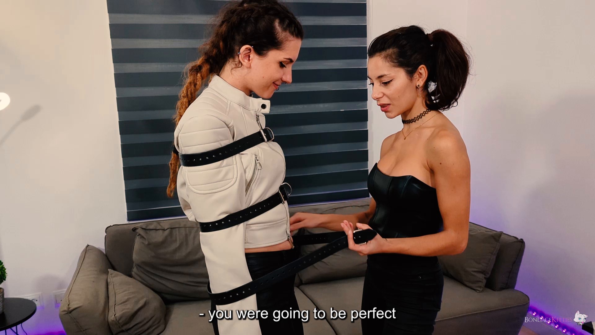 Mayla takes the leather straps she has ready with all the leather bdsm material. She offers Tenjou to tie her up, she accepts, Mayla puts straps all over her body, from her chest to her ankles, restraining her like a mummification, she can’t move, Mayla takes a handkerchief and makes a cleavegag, then with a special leather bandana, she gags her in OTM gag. Mayla takes Tenjou on the floor, gets on top of her and rubs her whole leather body all over Tenjou, puts her ass on her face, and moves very sensually on top of her, Tenjou who can’t do anything, enjoys the experience.