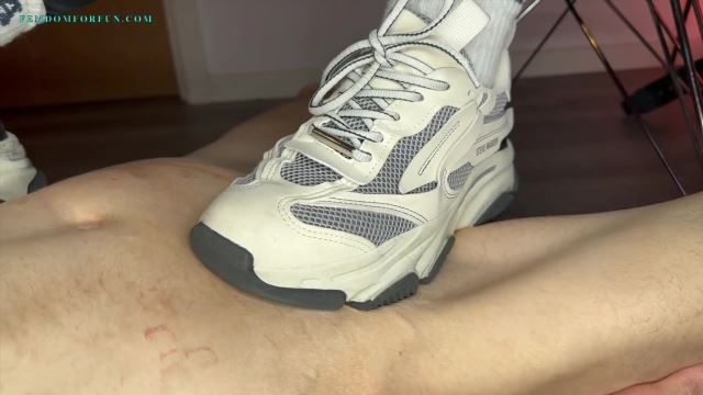 Sitting very comfortably on the chair Tainted Maitrise has a slave at her mercy. So basically she’s using his cock and balls as a footrest while taking pictures of him and also she makes a phone call to Miss Anna Elite to tell her about him and how pathetic he is. As you can see she doesn’t really care much about him as he is just an object for her. You can see very well that his cock and balls just disappear beneath the beautiful trainers of Tainted Maitrise.