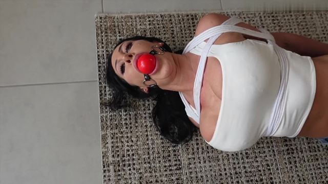 The babysitter struggles on the couch, but the ropes are very tight, so tight that her already magnificently large breasts are even more stretched! Drool is dripping profusely from her mouth! This gag is truly enormous!