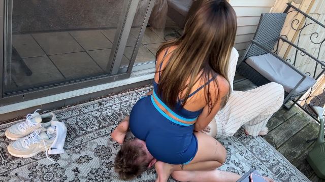 Goddess Ellen sits on her slaves face outside on the balcony in broad daylight. She does this right after working out in her sexy gym clothes. The smothers the slaves face under her big Brazilian ass. People walk by and see and she pauses and then continues to smother his face under her ass.