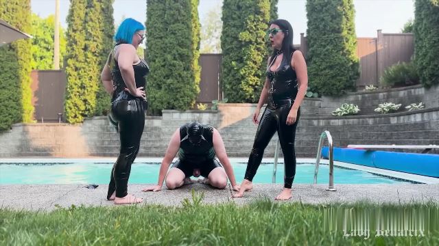 This rubber pool boy has literally one job. To clean the pool. And he’s not doing a very good job of it! So Ms Sinstress and I need to remind him of his place. Nothing a little ballbusting won’t solve. We kick him hard in the nuts with our bare feet, clad in latex. He winces in pain as we spare no mercy on his balls. We can’t go in the pool because he hasn’t done his job properly. Maybe he should see how filthy the pool is, the pool he was supposed to clean. We shove him into the water and when he makes his way back to the surface, we resume kicking him in the balls before letting him to return to his duties.