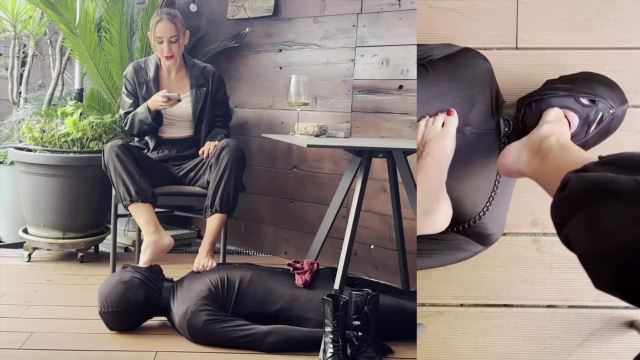 Oh I forgot to mention, the building in front was under renovation so I guess all the workers saw this pathetic bitch under the table and than licking my feet. What a loser, lucky for him I allowed to wear his black costume.