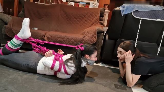 She creeps up to Liricaa by surprise and ties her wrists behind her back, Andy then gags Liricaa with a ballgag so she can remain quiet while Andy ties her chest and legs.