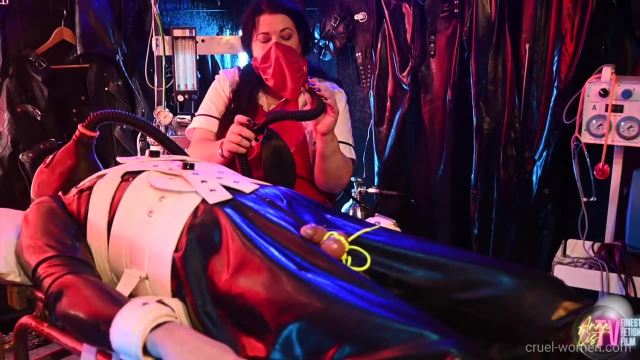 Join Nurse Anna in her new gummi klinik where she is restraining her rubber clad patient down to her very old and original mortuary trolly in readiness for more very special treatments.