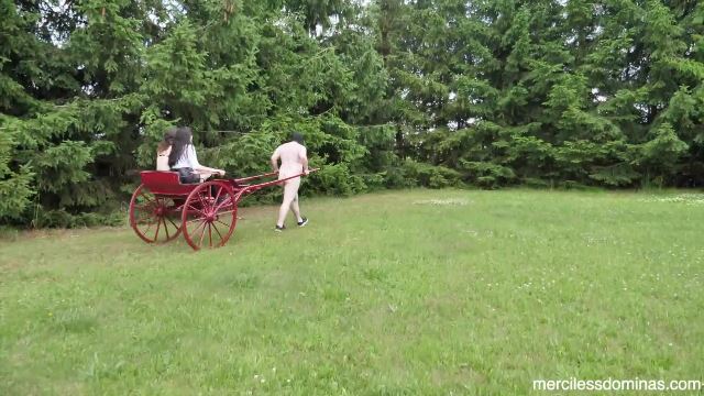 Beautiful morning, two gorgeous ladies and pathetic service bitch. Miss May and Cate McQueen had plans for a good ride around the farm and ordered a cabbie. But he was so inexperienced and useless so the ride was ruined and the Mistresses were enraged. The best way to teach this man is to whip and spank him hard. This cabbie is miserable that he couldn’t even stand a few gentle whip lashes but ladies won’t give up and continue the hard lesson for a pathetic service bitch that ruined their perfect morning