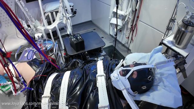 Clinical Erectile: it’s time to intensify the electrics so the orgasm can be the most powerful. Starting with a powerful cock pump, a vigorous wanking machine will be thrusting, the electrics working, and this lucky sub is fitted with a full rubber covering, including a rubber sheet across the chair to lay and feel encased. On top is an additional layer. Lots of lube and hey presto the device can be fitted. A nice headshot allows some wide and close views of this serious attachment play.